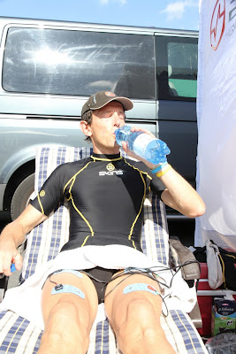 je me lave,fait sécher mon équipement, compex récup active, demi bouteille de cranberry avec les protéines du coach de st hub et du malto et une demi bouteillenon pas de whisky mais de vichy. Dès le compex terminé, j'enfile mon pantalon et maillot de compression et essaye de me reposer un peu.